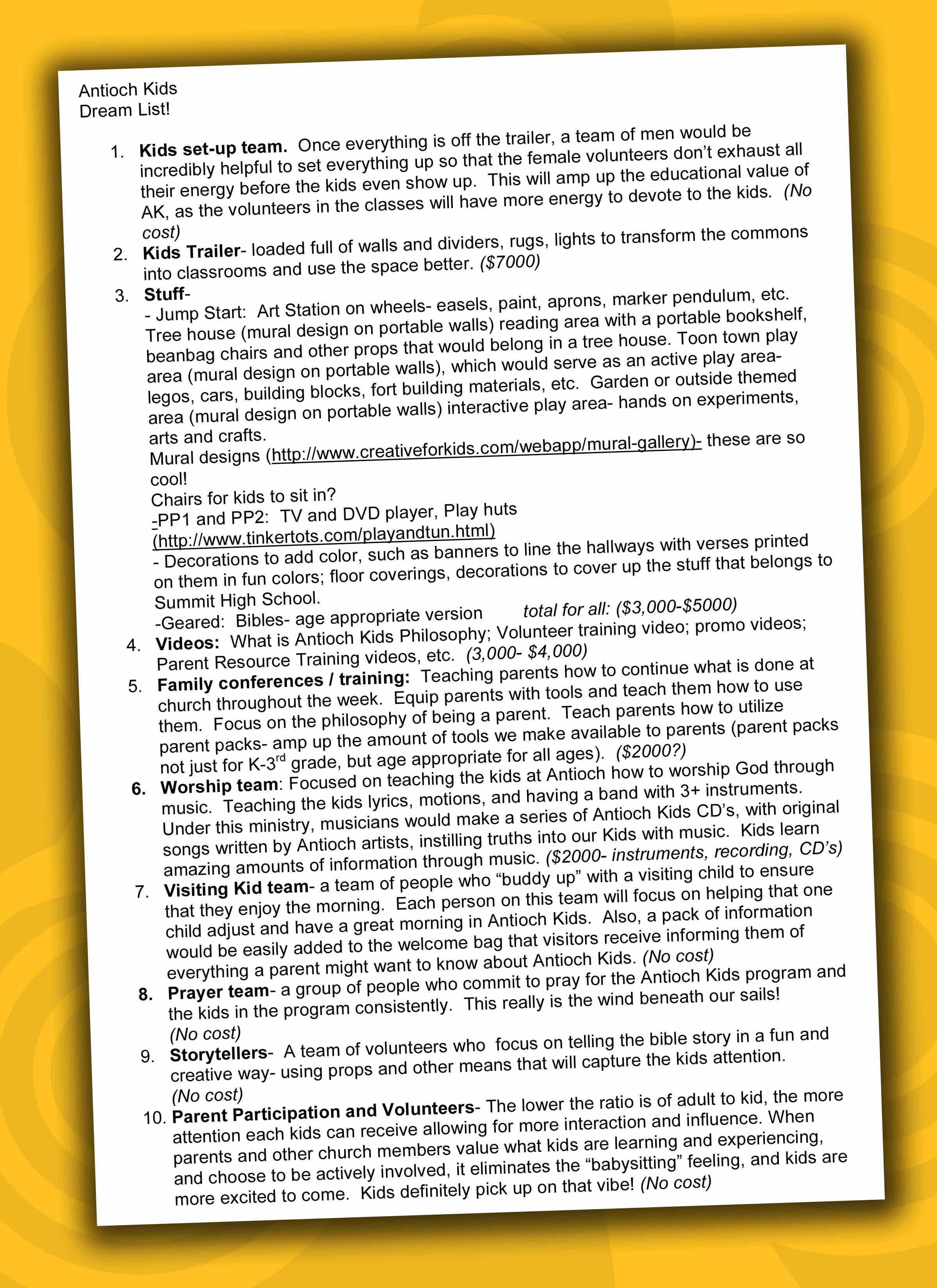 So I went down to see Linda VanVoorst, Antioch’s Children’s Director, and asked, “If you were to come up with a top ten list of what is needed to make the Antioch kids program the absolute best it possibly can be – regardless of money, what would it be?”